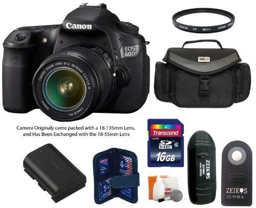 Canon’s EOS 60D bridges the gap between the novice and the seasoned pro with a perfect combination of high-speed and quality. It features an APS-C sized 18.0-megapixel CMOS sensor for tremendous images, Full 1080p HD Video, DIGIC 4 Image Processor for fine detail and superior color reproduction, and improved ISO capabilities up to 12800 for uncompromised shooting even in the dimmest situations. It features a refined Vari-angle 3.0-inch Clear View LCD (1,040,000 dots) monitor, supercharged Live View Function with Face Detection Live Mode, plus a number of automatic Image Correction settings and HDMI output for viewing images on an HDTV. Kit Includes: Large Vidpro Camera and Lens Case (Black), Extra High Capacity Lithium-Ion Battery Pack, Transcend 16 GB Class 10 SDHC Memory Card, Card Reader, UV Filter, Memory Card Case, Zeikos Shutter Release, Digital Camera Cleaning Kit Please Note: This Canon 60D came packed with a canon lens kit, the lens was removed from the box and the 18-55mm lens has been added, the camera is still in it’s original canon box with all its original accessories and manuals and warranty.