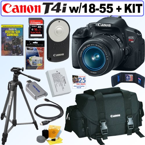 Canon EOS REBEL T4i 18.0 MP CMOS Digital Camera with 3-inch Touchscreen and Full HD Movie Mode – Body (Includes manufacturer’s supplied accessories) Canon EF-S 18-55mm f/3.5-5.6 IS II SLR Zoom Lens – 5pc Deluxe Lens Care & Cleaning Kit Canon LP-E8 Rechargeable Lithium-ion Battery Pack – Canon SLR Gadget Bag w/Pockets & Strap – Canon Deluxe 62 Tripod w/Carrying Case – Canon RC-6 Wireless Remote Controller SanDisk 16 Gigabyte SDHC Extreme HD Video Class 10 Memory Card – Secure Digital USB Card Reader – Universal Memory Card Wallet Pack of LCD Screen Protectors – Jumpstart Guide to Digital SLR Cameras – HDMI cable for HDTV connection – Free 25 Quality Prints