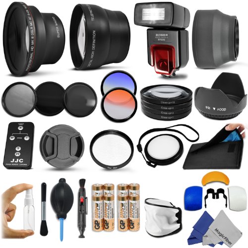 - Includes: .43x Wide Angle and 2.2x Telephoto Lenses + Bower SFD35C E-TTL Dedicated Hot Shoe Flash + Infrared Wireless Remote Control + Filter Kit (Ultraviolet UV, Polarizing CPL, Neutral Density ND4) + Macro Close-Up Set + Tulip Flower Lens Hood + Collapsible Soft Rubber Lens Hood + Star Filter + White Balance and Center Pinch Lens Caps + 2 Color Filters (Colors May Vary) + Filter Carry Pouch + Pop-Up and Soft Flash Diffuser Kit + Camera Lens Cleaning Kit + MagicFiber Microfiber Lens Cloths